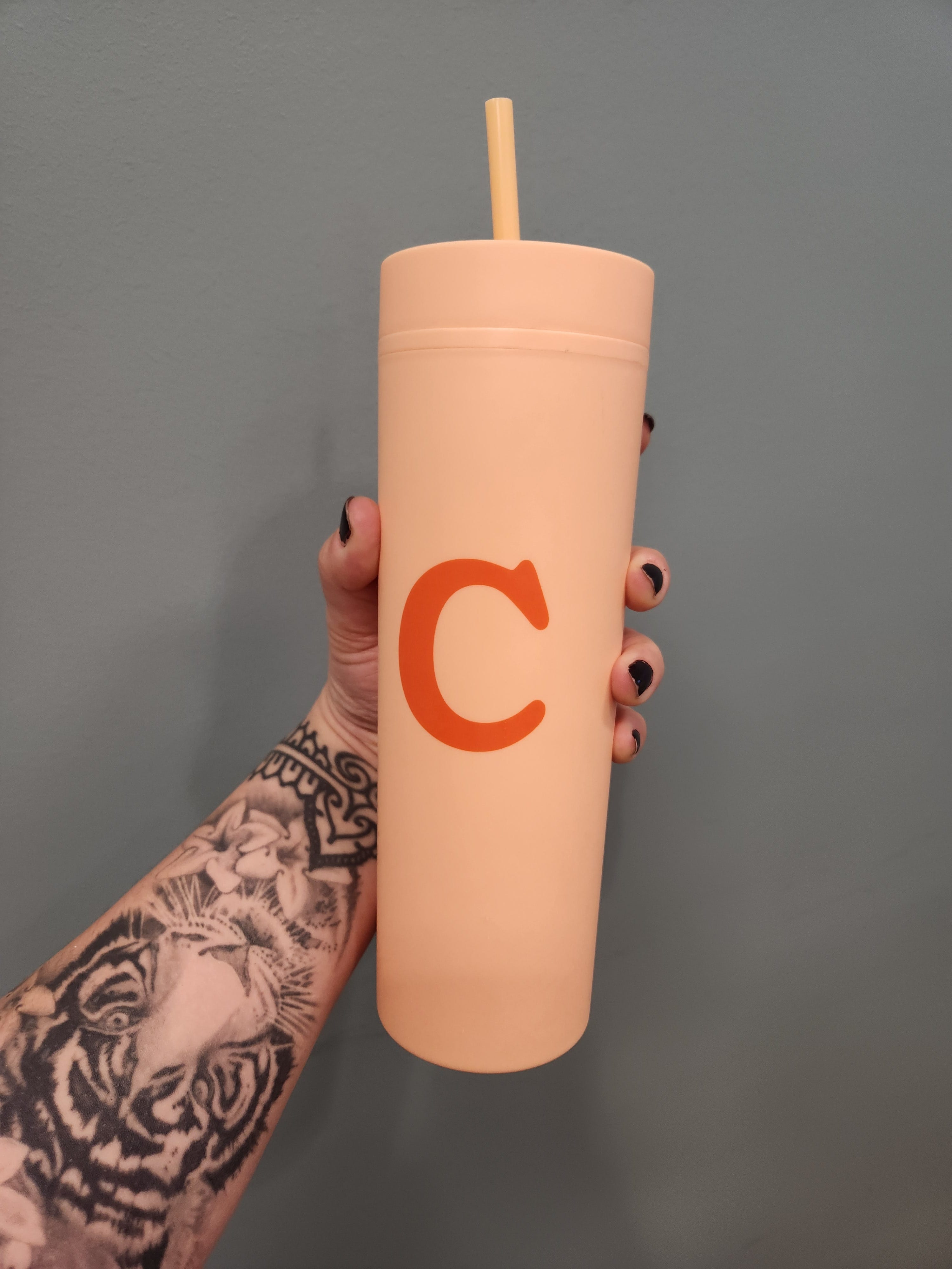Look at this cup; it’s my new favorite keep cup/tumbler to hold my water as I go about my day. I like it because it’s got bright colors, has a lid and the first initial of my name. And I don’t have just one no no, I have several of tumblers like this. Different colors, star signs and slogans on them. And you have to have different ones for hot and cold drinks; those just don’t mix.